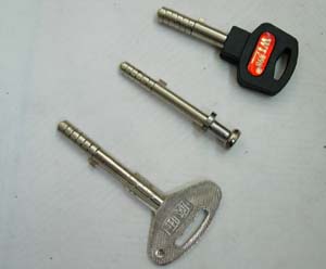 磁性锁后调三件套是开磁性锁的克星,使用方法是先松开旁边的小螺钉,插进锁孔转动,如打不开,可转动后面几十度,再插进去试,一直到开启为止,也可拧动前面的磁圈。